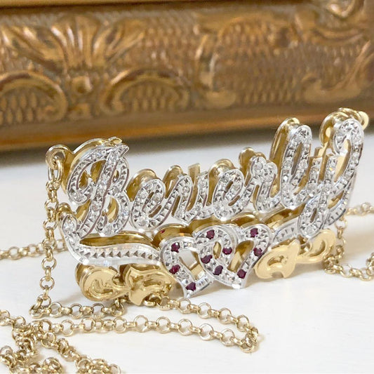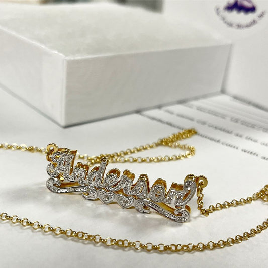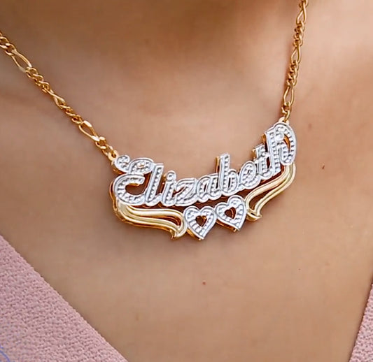 3D Double Plated CZ Nameplate Necklace - Two Hearts
