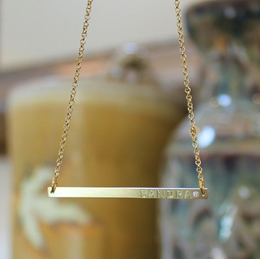 Engraved Gold Horizontal Bar Necklace with Birthstone