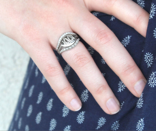 Sterling Silver CZ and Pearl Oval Monogram Stacking Ring