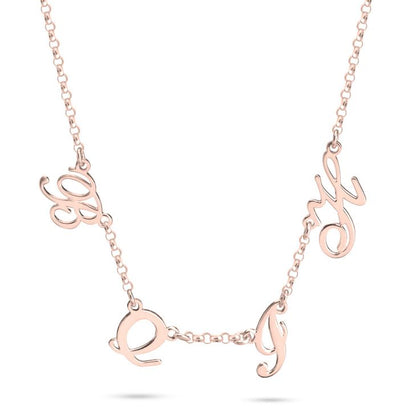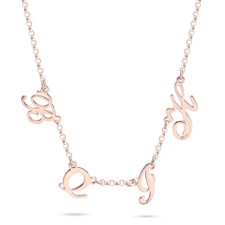 This necklace features up to 5 script font mini sideways script initial pendants that are approximately 7mm (.3") each. This gorgeous necklace includes a 1.5mm rolo chain in the length of your choice. This necklace makes a perfect mother's necklace!