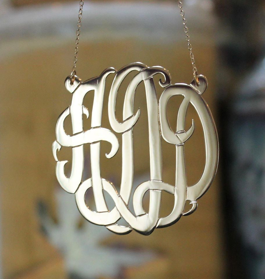 This beautiful, hand made Fancy Script 24K Gold Plated monogram necklace is the perfect choice. The pendant is made of .925 sterling silver and then dipped heavily in 24K Gold, completed with a shiny, luxurious finish. Hangs beautifully from on a split 16", 18" or 20" 24K Gold Plated link chain. Also available in sterling silver, rose gold plated and 14K gold.