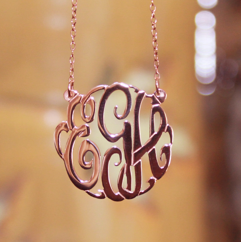 This beautiful, hand made 24K Pink Rose Gold Plated Fancy Script monogram necklace is the perfect choice. The pendant is made of .925 sterling silver and then dipped heavily in 24K Rose Gold, completed with a shiny finish. Hangs beautifully from on a split 16", 18" or 20" 24K Rose Gold Plated link chain.