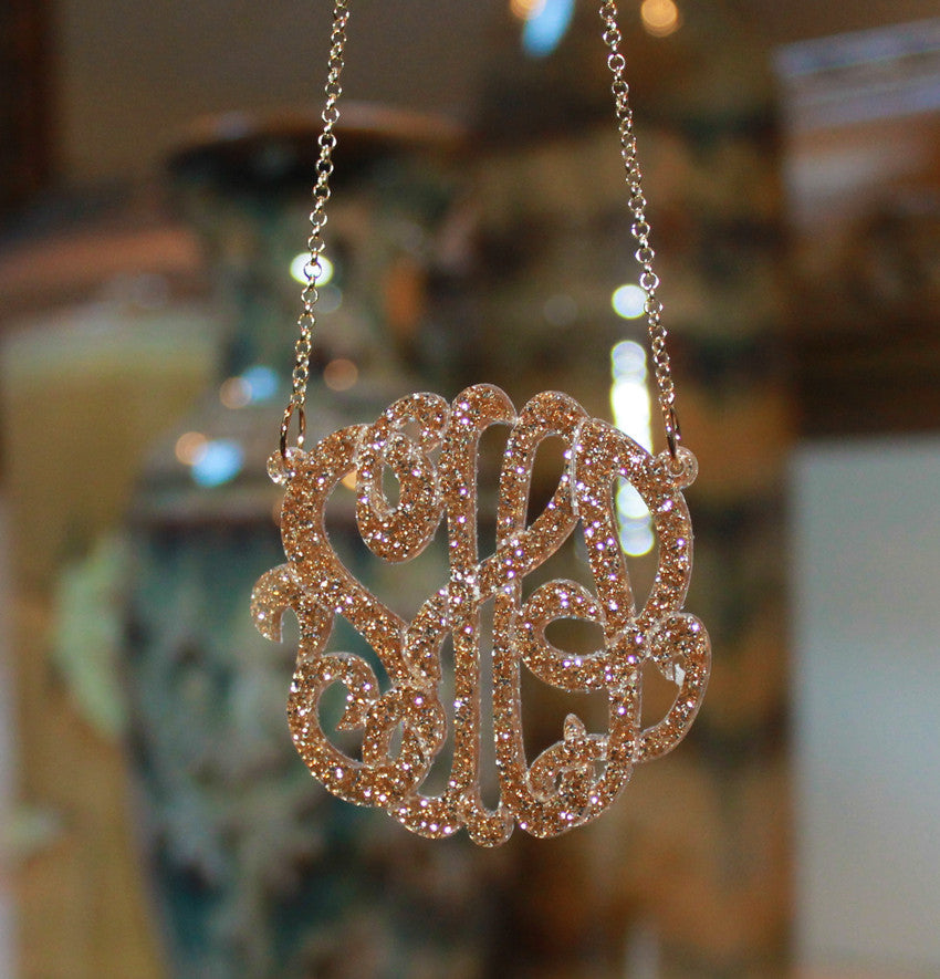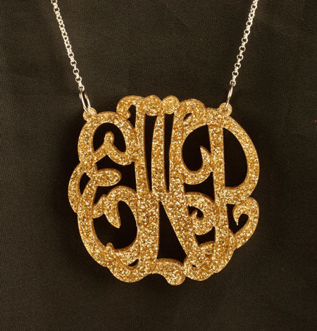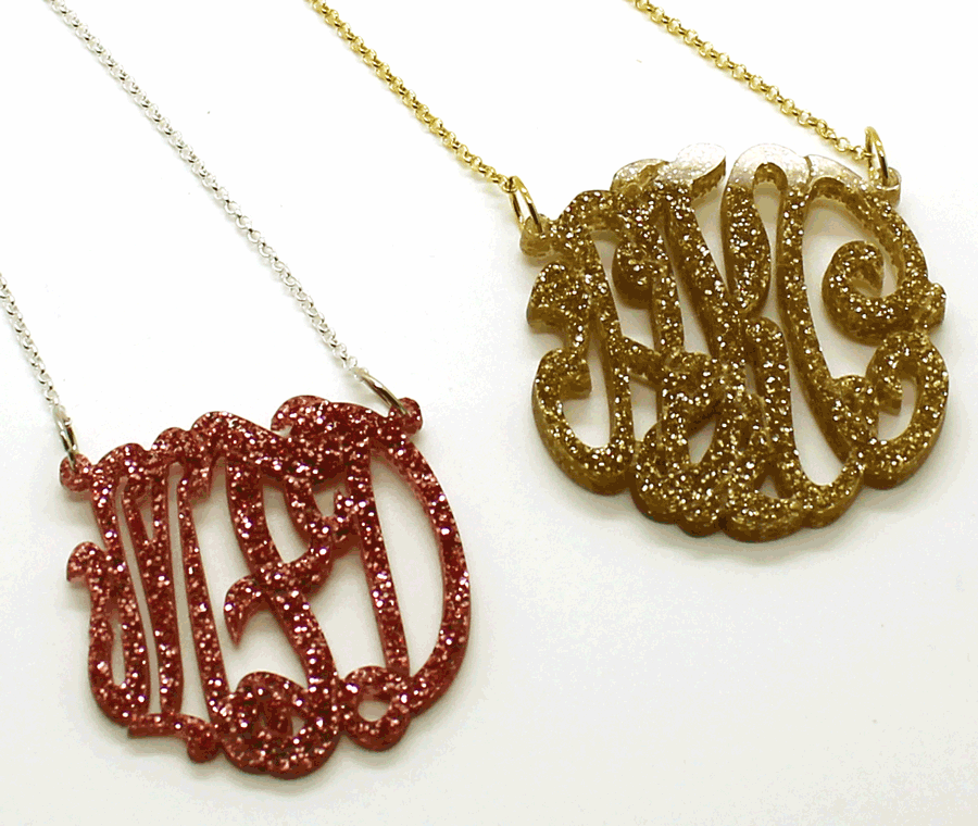 Our acrylic script monogram necklace collection are personalized with your initials. Available in a large variety of colors, so you can create your monogram acrylic necklace to suit your personal style. The mirrored acrylic and glitter acrylics are customer favorites. A black or white acrylic monogram necklace coordinates with any out. Choose a bright, bold yellow or orange to add a pop of color! The acrylic monogram necklace is the latest trend in personalized jewelry ~ and the bigger the better. Hangs beautifully from a sterling silver or gold vermeil, or rose gold vermeil chain in the length and style of your choice.