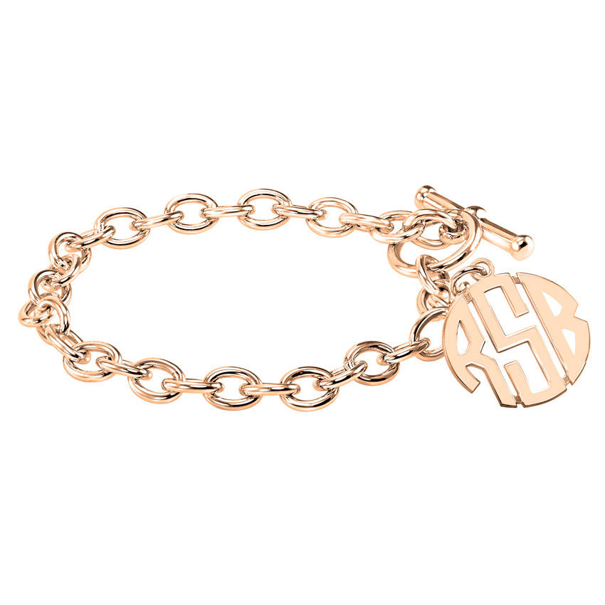 This beautiful classic block monogram bracelet is the perfect gift. The monogram measures 20mm (.78") and hangs beautifully on a toggle style link bracelet. Available in gold plated or sterling silver with rhodium plating.