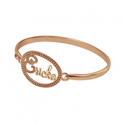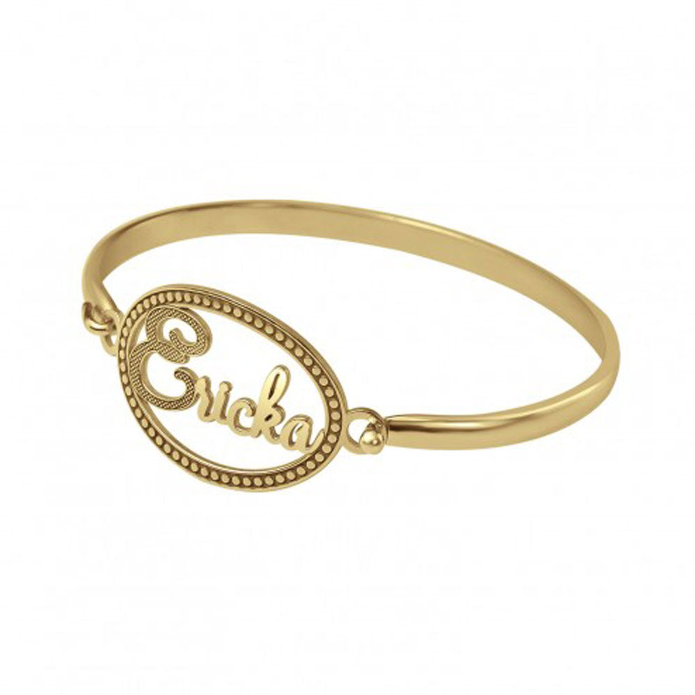 This classic bordered name bangle bracelet features a beaded border and a threaded style first letter. This personalized name bangle bracelet makes the perfect gift.