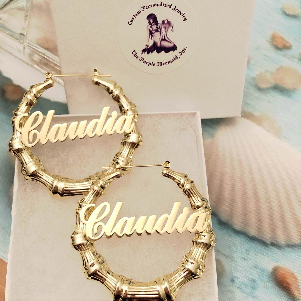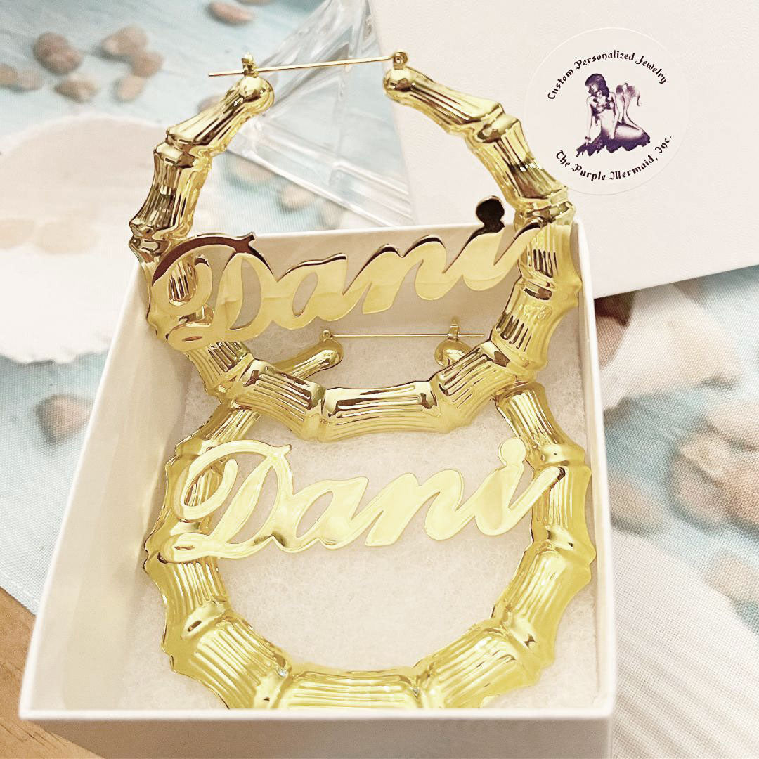 Our Classic Script Bamboo Name Earrings never go out of style. This style hoop earring features a pretty, cursive handwriting style nameplate. They can be personalized with a name with a minimum of 12 letters. Get yours today. Available in nine great sizes! You choose how loud you want to shout your name. Extra Small to Extra Extra Large.