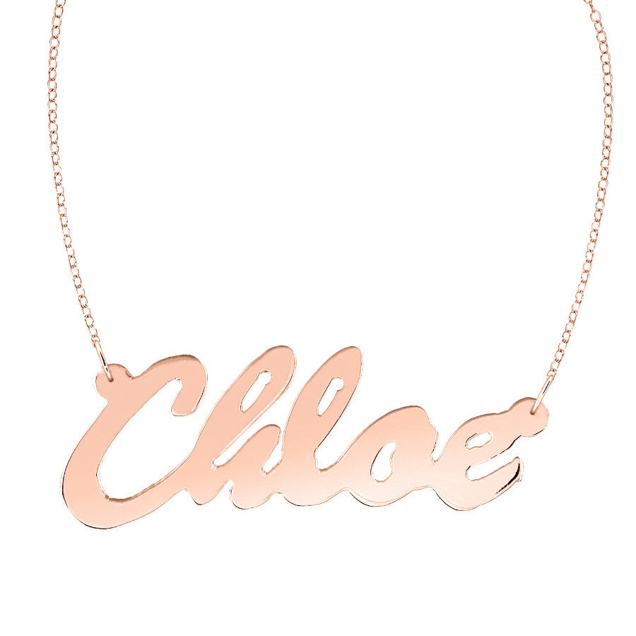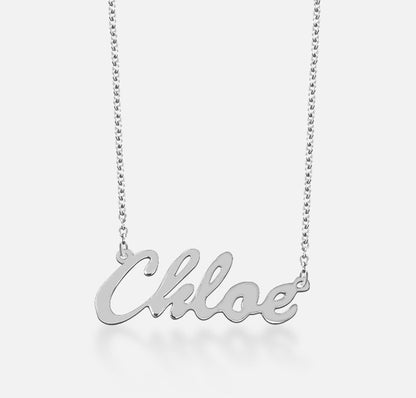 This gorgeous nameplate necklace features a beautiful cursive font and has been seen around the necks of all your favorite celebrities! This custom made beauty is created with .925 Sterling Silver (then heavily dipped in 24K Gold to a luxurious, polished finish for the gold plated versions). These beautiful necklaces are made just for you, so please expect this to ship in 2-3 weeks. This gorgeous nameplate is available 24K Gold Plated, 24K Rose Gold Plated or Sterling Silver. Hangs beautifully from a 16", 18" or 20" split chain.