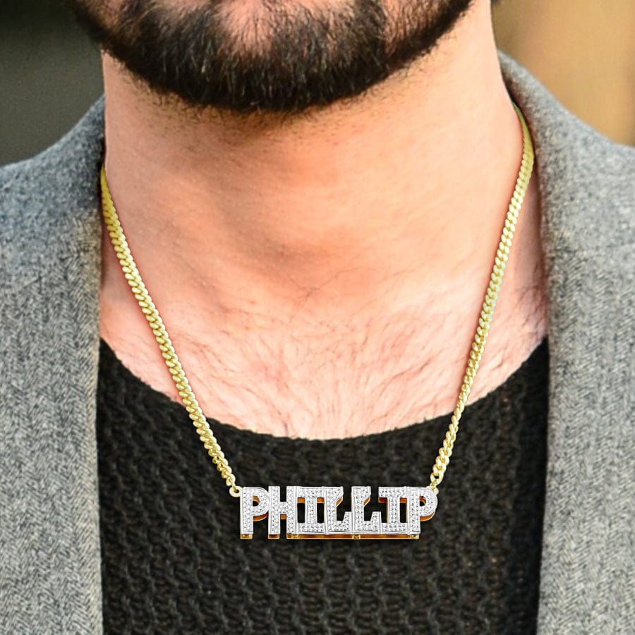 Our personalized double plated block name necklace features a handmade cut out style double nameplate in a classic lock font, Available in 14K gold plated with a rhodium beaded nameplate or all sterling silver. This trendy all capital letter name necklace hangs on a cuban chain in the length of your choice. Our 14k gold plated jewelry is a sterling silver base, dipped in luxurious 14k gold.