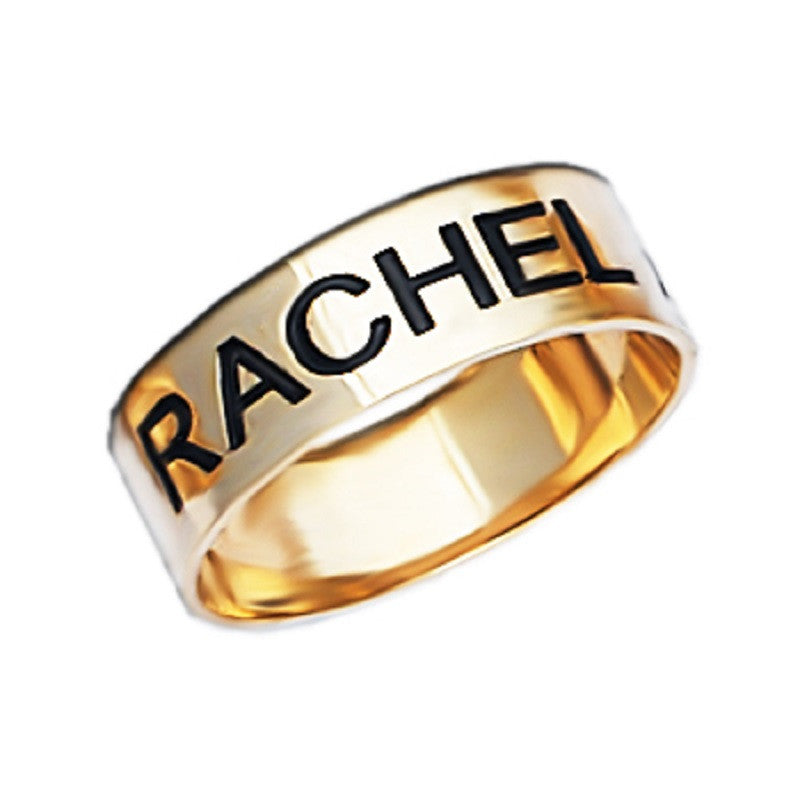 Our larger 7mm gold band ring is the perfect personalized promise ring. The wrap around name ring features the text of your choice in antiqued capital block letters. Choose from 14K solid gold, 10K solid gold, 14K gold vermeil or sterling silver.
