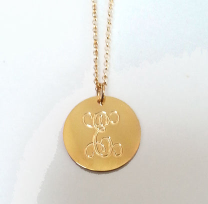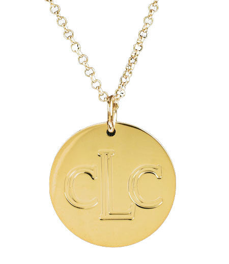 This perfect pendant measures 3/4", and hangs beautifully from a rolo chain in the length of your choice.  Choose from Roman or Script font.  Available in Sterling Silver, 14K Gold Vermeil, or 14K Rose Gold Vermeil.