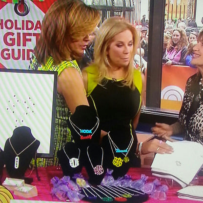 This Acrylic Nameplate necklace features a perfect fancy script font ~ classic yet trendy, this necklace is sure to be a favorite. You can choose a 14", 16", 18" or 20" chain in sterling silver or gold vermeil. Go on ~ Get creative! Perfect gift. As Seen on The Today Show with Kathie Lee and Hoda