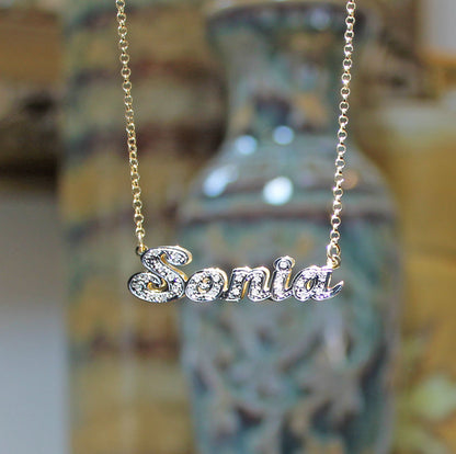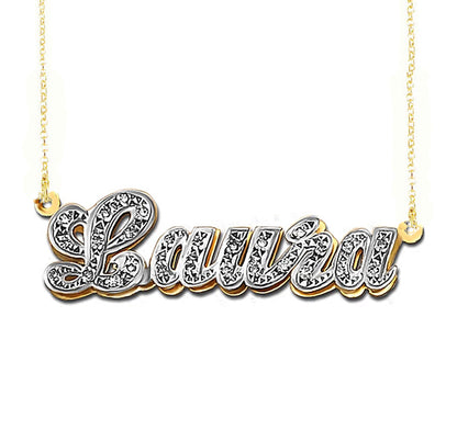 This unique 3D double plated nameplate necklace features sparkling CZ's. Nameplate measures approximately a generous 45 mm x 12 mm (1.75" x .47"). The nameplate is 14K gold vermeil. Top layer of nameplate is rhodium pen cut silver then dotted with approximately 25 pretty CZ's (depending on name) for just the right amount of bling.