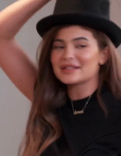 Check out Kylie Jenner wearing her "stormi" necklace. Please note that the first letter will be capitalized unless you specify all lowercase when entering your personalization (i.e., "Stormi" vs. "stormi").