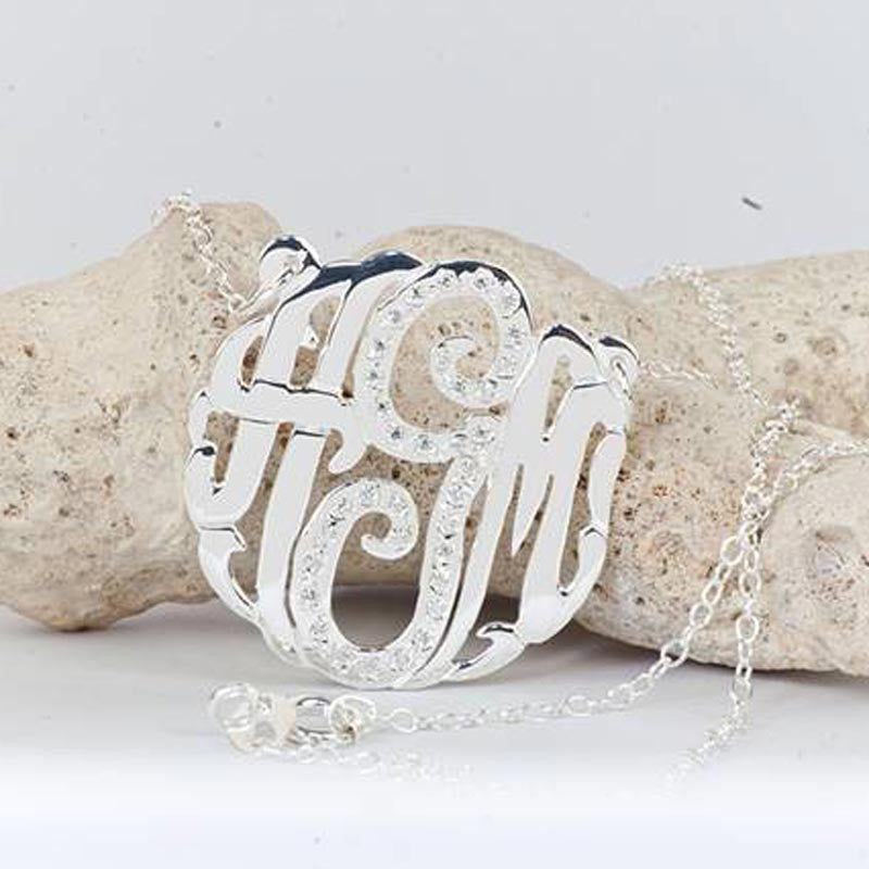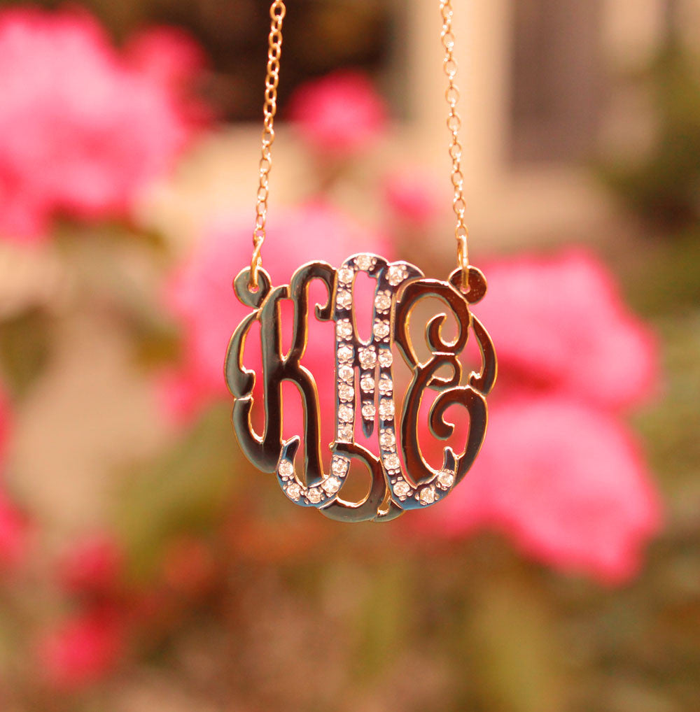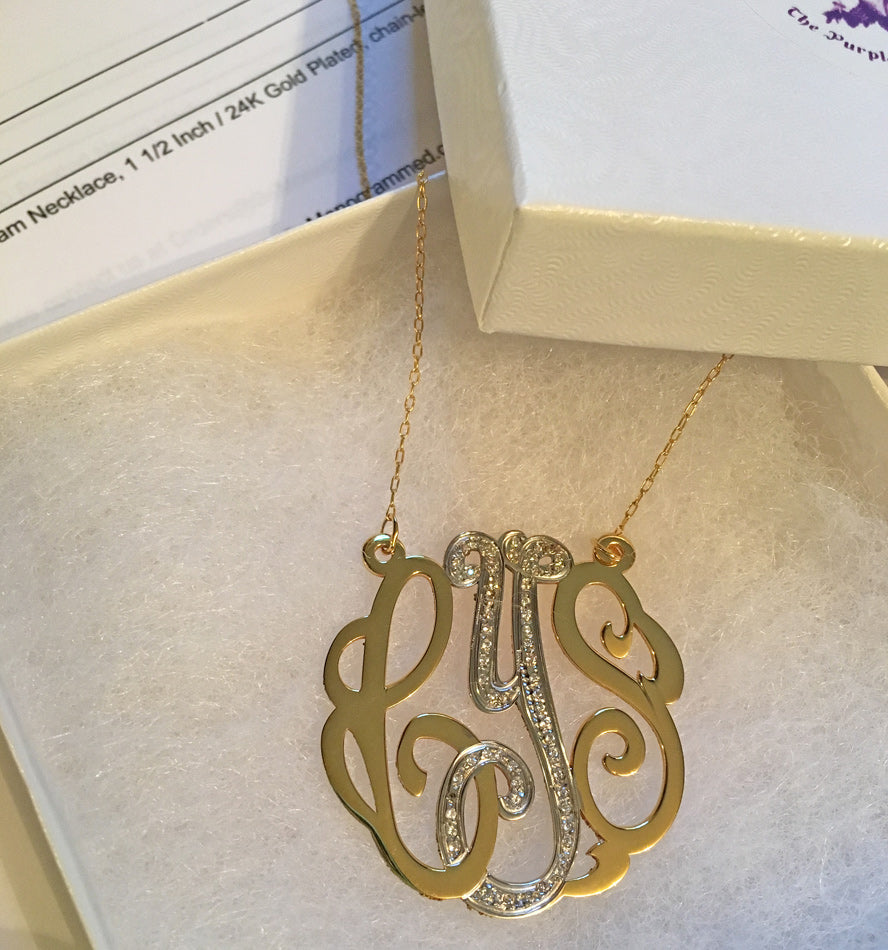 This monogram necklace is absolutely stunning, with the center initial covered in sparkling CZ's. Hangs beautifully from it's chain, in the length of your choice. Monogram can measure 7/8", 1.25", or 1.5", and depth is 0.7 mm.. Available in sterling silver, 24K Gold Plated or 24K Rose Gold Plated. This piece is hand cut and polished to a luxurious finish, and the stones are hand set just for you. Hangs beautifully from a 16" or 18" chain, with a split chain style attachment. This necklace is a real traffic stopper!
