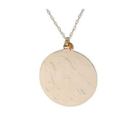 Initiate a conversation without uttering a single word with this 22K Gold Vermeil Engraved Monogram Coin Pendant and Necklace. Sophisticated and sentimental, this gold vermeil pendant will be a treasured keepsake when engraved with a single script initial or a three initial script monogram. The simple disc hangs beautifully from a delicate chain and makes it a wonderful piece that can be worn with all your looks. Available in 1" Diameter ~ 1 5/8" Diameter. This beauty is created just for you, so please expect this to ship in 2-3 weeks. Indulge!