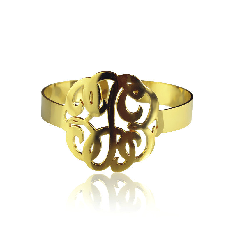 This 18K gold plated over .925 sterling silver cuff bracelet features a 1.6" large round monogram. The cuff style bracelet is available in 6", 7" or 8" length. Choose your 3 initial monogram in our pretty script font. Perfect gift idea.