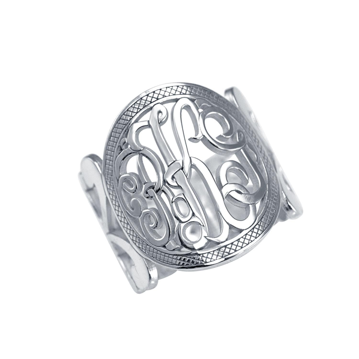 A gold monogram ring, personalized with your encircled initials features delicate rope detailing and curved fixtures for that nautical look. Each monogram is hand drawn with your initials and then fashioned out of .925 sterling silver, or .925 sterling silver dipped in gold. Measures 18mm (.71"). Available in sizes 5-12.