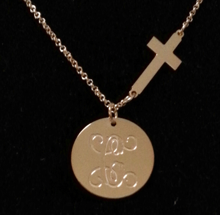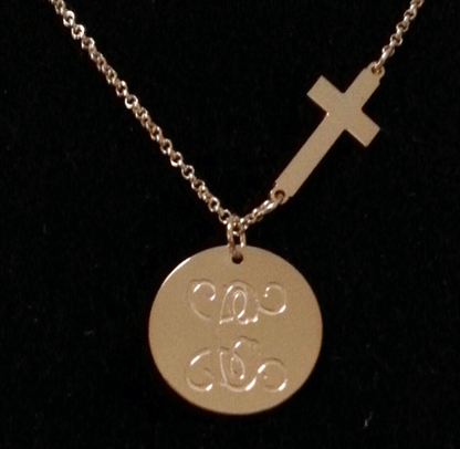 Our Engraved Disc and Sideways Cross Necklace is personalized just for you. As seen on all of your favorite celebrities ~ the 14K Gold Vermeil Side Cross Necklace features a 3/4" cross paired with a 3/4" engraved disc, and is available on the chain length of your choice. The disc can be engraved with a single initial or a monogram, in script or roman font. Available in 14K Rose Gold Vermeil, sterling silver, 14K gold, 14K rose gold or 14K white gold as well. Ships in approximately 2 - 3 weeks.