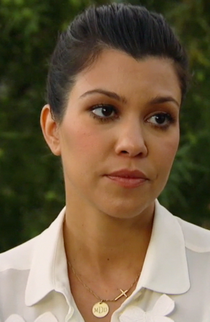 Kourtney Kardashian wears a 3/4" sideways cross with 3/4" engraved disc in roman font