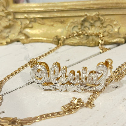 Our personalized double plated beaded nameplate necklace for kids features a smaller version of our ever popular style - name, underscored with a pretty heart. This name necklace is a handmade cut out style double nameplate measures approximately 1.25"L x 0.55"H depending upon name. Available in gold vermeil with a silver rhodium beaded nameplate or all sterling silver. The rhodium beaded finish adds sparkle and shine. Hangs on a cuban link chain in the length of your choice.