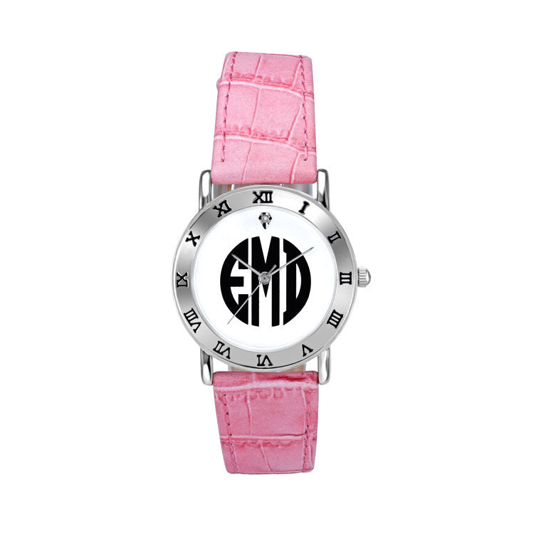 A personalized watch on a pink leather strap makes the perfect gift. Our watch features a personalized monogram in block lettering centered on a white background with a CZ diamond placed at high noon. The silver tone border adorns roman numerals while the adjustable genuine pink leather strap completes the look. (32mm)