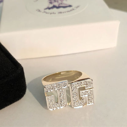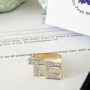 This large block diamond initial ring features two capital letters decorated in sparkling diamonds. This hand cut, personalized name ring measures a generous 12 mm (approximately 0.472") in height, so sure to get you noticed. Available in gold vermeil, .925 sterling silver, 10K gold and 14K gold (approximately 4.5 dwt / 6.99 g).