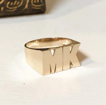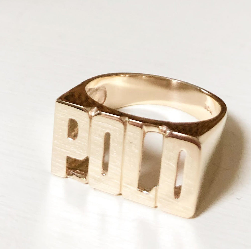 This large block gold name ring features a hand cut design that is perfect for showing off your name, in capital letters. This makes a perfect gift for that special someone.   This heirloom quality gold ring is the ultimate extension of your personality!