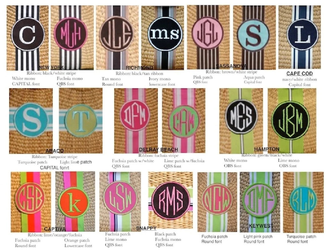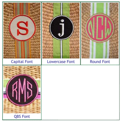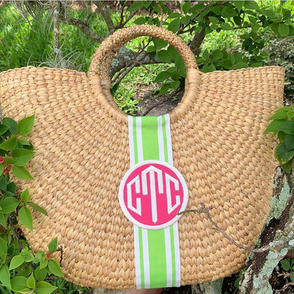 The medium half moon basket is personalized with your choice of grosgrain ribbon and monogrammed medallion.  Size: 13" x 9" x 4".   The medium is the perfect luncheon size or if you are small in stature, the perfect daily purse.