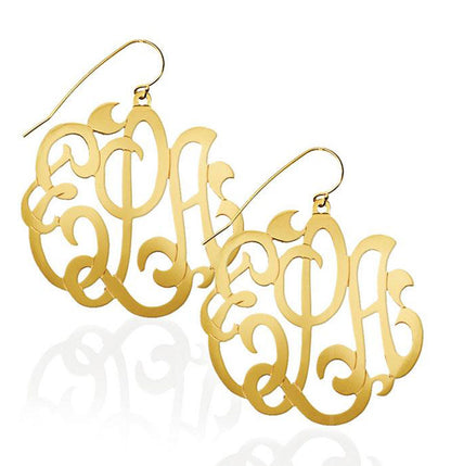 Our large monogram dangle earrings are offered in three great sizes - 1.5", 1.75" and 2". Available in 24k gold plated or .925 sterling silver. Our 24K gold plated earrings are a sterling silver base, dipped in luxurious 24K gold. These great monogram earrings make a statement and the perfect gift.