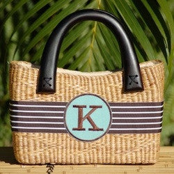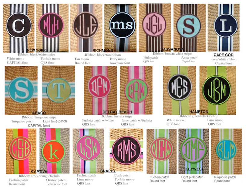 The small Beverly Basket is lined with a zipper closure. The photos show the basket with 2 combos. The first sample is our Richmond Combination (blk/tan stripe grosgrain) w/tan mono & QBS font. The 2nd is the Sassanova Combo (brown/wh stripe grosgrain) w/aqua patch & single CAPITAL font 'K'. Measures 7" x 10" x 2.5".