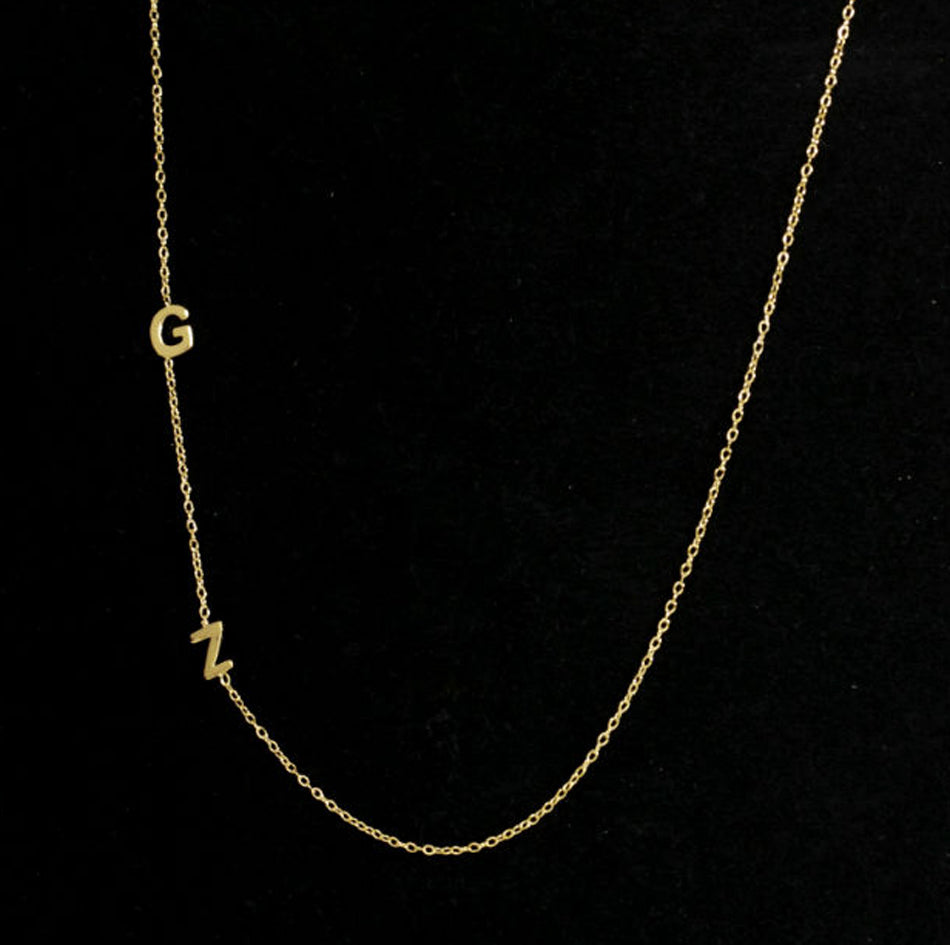 Our multiple block sideways initial necklace features the letters of your choice (up to 6 letters). The little .32" letters are centered and attached on a delicate cable chain in the length of your choice. Available in .925 sterling silver, 24K gold plated, 24K rose gold plated.