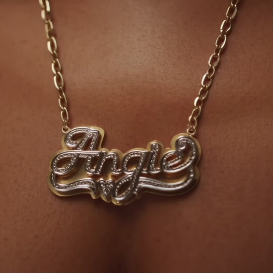 Our gorgeous personalized double nameplate necklace features a 18K gold vermeil plate, anchor layered with your name. The sterling silver rhodium diamond cut style of the name creates eye catching sparkle. This larger 3D nameplate measures approximately 2" depending upon the name. Available on a figaro chain, in the length of your choice.