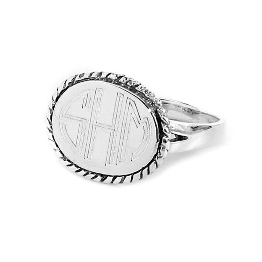 Our silver plated oval rope trim monogram ring features your monogram encased in a rope border, set on a split band.