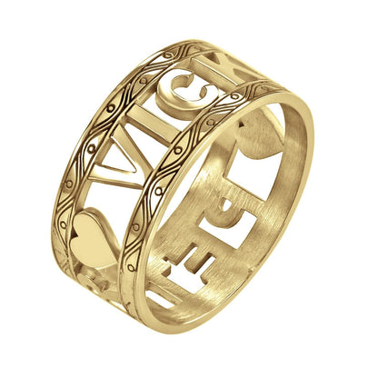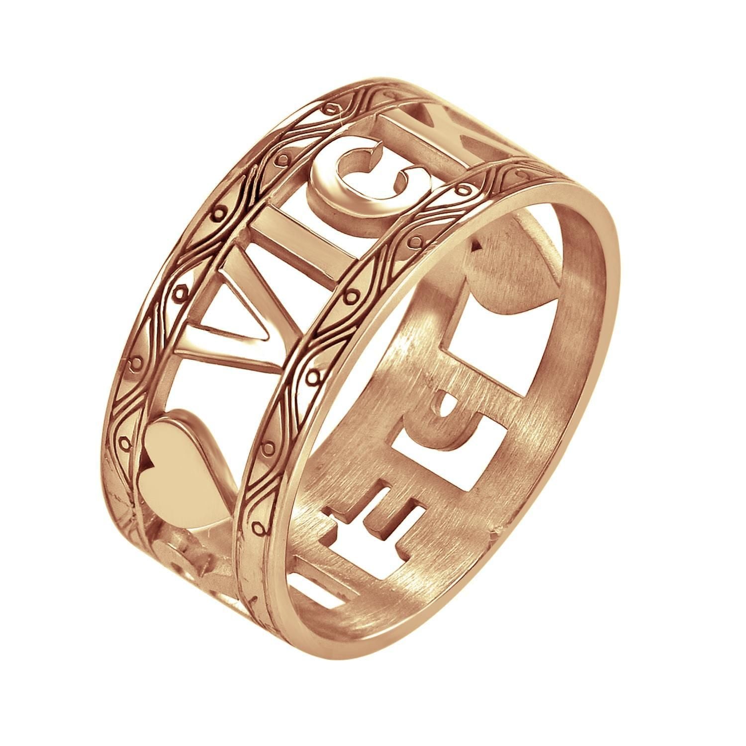 Our personalized decorated border couples ring features two names separated by hearts. The ring can accommodate 11 characters TOTAL (both names).