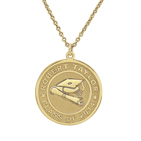 Celebrate graduation with this medallion necklace, featuring your name and class year. The pendant measures 20mm (.78") and is available in gold plated .925 sterling silver, rose gold plated, 10K gold or 14K gold.