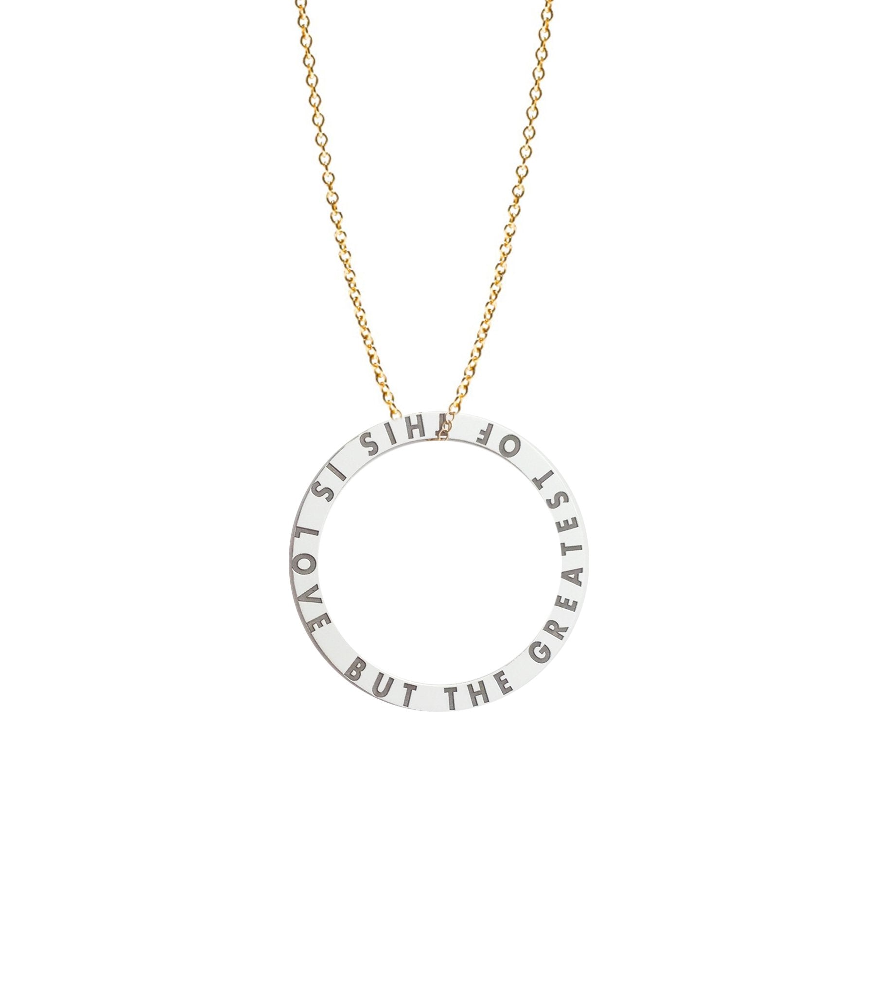 This personalized infinity circle loop necklace features your special text, up to 40 characters/spaces in all capital block letters. Choose mixed metal (sterling silver medallion / gold plated chain), all gold plated or all .925 sterling silver. The medallion measures 1" (medium) or 1 3/4" (large). Makes a real statement and looks great layered with your other favorites. Makes a perfect family necklace.
