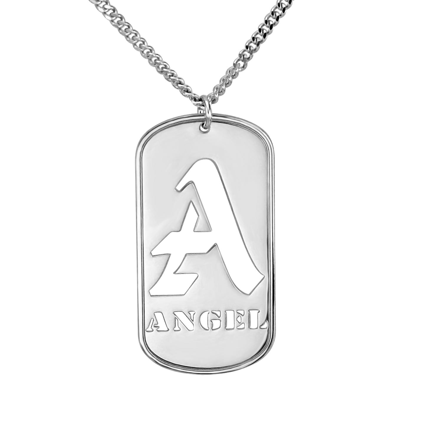 The personalized men's dog tag necklace has a high polished finish and measures 1.65" x .83". The cut out designs features a large single initial above the name (8 character max). Available in sterling silver with rhodium (white gold) plating for extra tarnish resistance, or 14k gold plated.