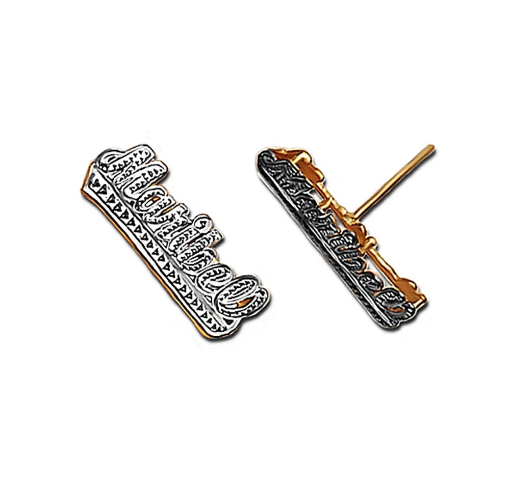 Our double plated name earrings with tail can be designed with first letter uppercase (featured) or all lowercase letters, just for you. The double plated post earrings feature a rhodium, silvery diamond cut finish on the surface to give these personalized earrings eye catching appeal.