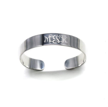 This trendy slim 10 mm (.39") high cuff bracelet can be personalized with your initials, your name or any message you like! Monograms will have larger center initial (unless you specify otherwise). One size fits most, 6-8" wrists. Perfect addition for any arm party.