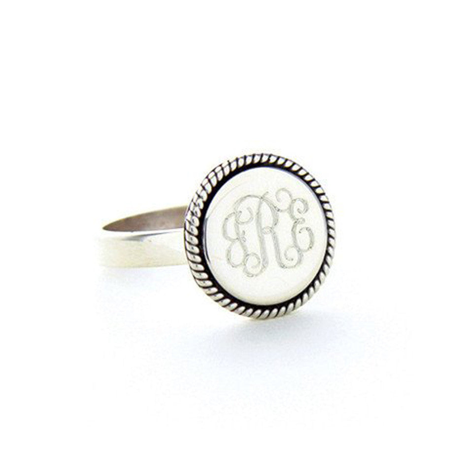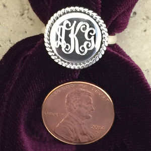 Personalized jewelry is so hot! This ring is a perfect addition to your sterling silver collection. The unique rope trim gives this ring that extra special touch! The round face measures approximately 15 mm. including rope edge. Available in sizes 4-10.