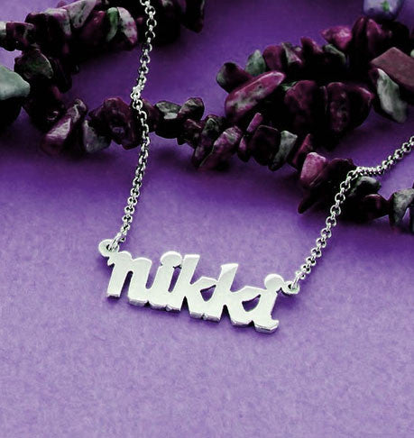 Perfect for those who love a petite nameplate, or as a mommy necklace featuring the name of your child. Available with up to ten characters in length, in a pretty lowercase font. This necklace is made of sterling silver and high polished for a shiny finish. Necklace hangs beautifully from a split chain, 16 or 18 inches in length. Available in 24K Gold Plated too!