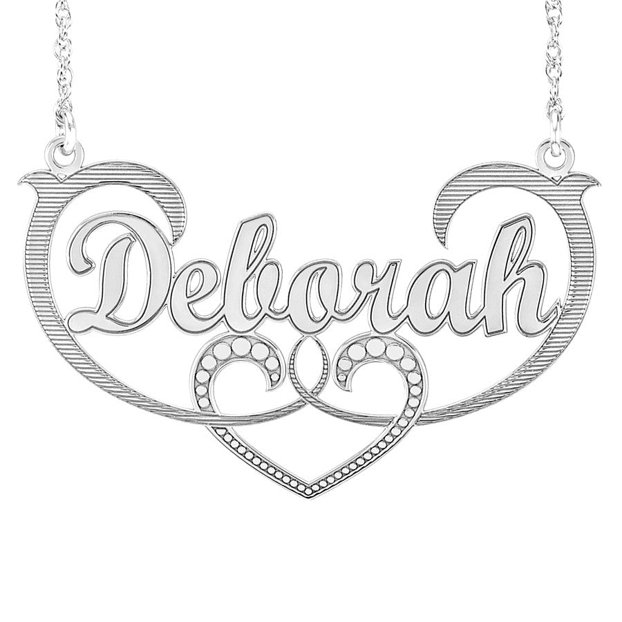The scrolling heart nameplate necklace features your script name with textured scrolls forming a unique flowing base and a beautiful heart. Choose up to 8 characters max, and the chain length of your choice. Chain features a spring ring clasp. Available in sterling silver with rhodium plating for extra tarnish resistance, yellow gold plated, rose gold plate, 10K gold or 14K gold.
