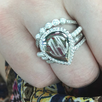 Silver Pearl and CZ Rimmed Teardrop Monogram Stacking Ring