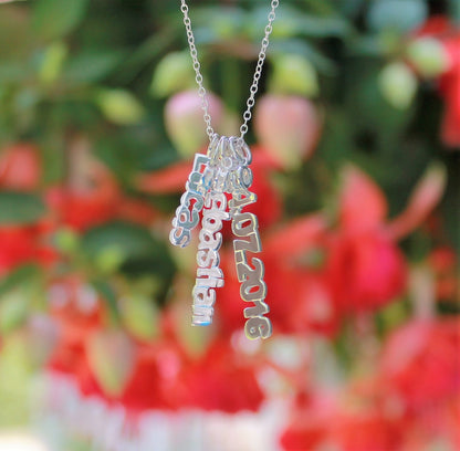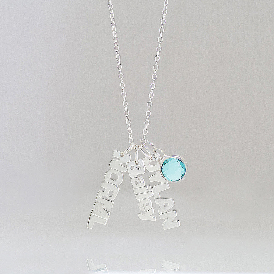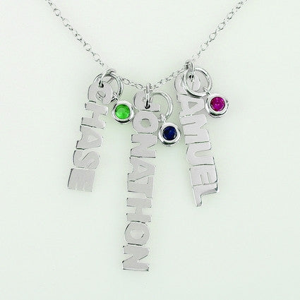 The vertical mini nameplate necklace with birthstones makes the perfect mommy necklace. The .925 sterling silver nameplate necklace features from one, up to 6 nameplates and birthstones of your choice. Hangs beautifully from the chain of your choice. Nameplates measure approximately 1" x 1/4" depending on the name. Each name may have up to 10 characters max.