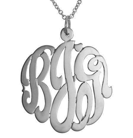This Sterling Silver Cutout Monogram Necklace is the perfect choice! One of the hottest celebrity trends this year, the cut out monogram necklace has been seen around the necks of all your favorite stars. Each monogrammed piece is hand cut in an elegant script style. Because they are all handcut, each piece is a little different. This gorgeous pendant is hung from a 16” or 18” chain. This look can be yours so treat yourself, you deserve it! Available in a petite 5/8" size , a 7/8" size, a medium 1 1/4" size, or a larger 1 1/2" size. The 1 1/2" size is the most popular. Traditional monogramming style usually features the first name initial, the last name initial (larger in the center) and the middle name initial. Ships in 2-3 weeks.