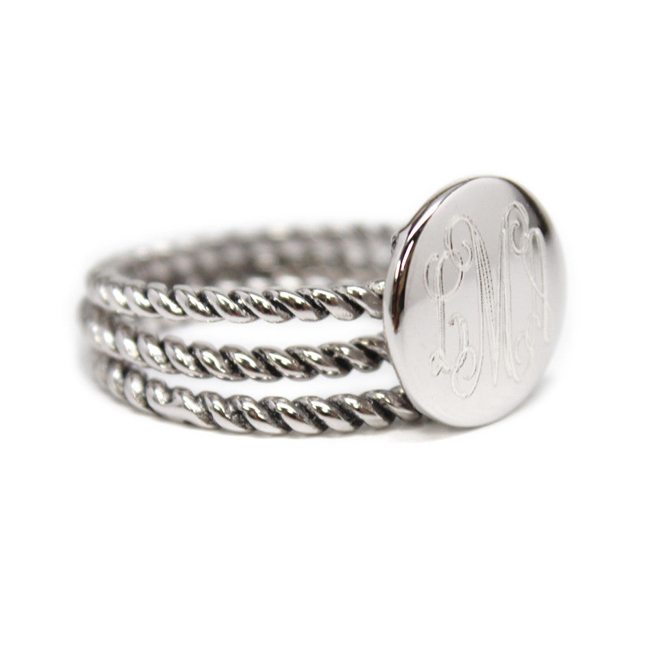 Our sterling silver round rope trimmed monogram stacking ring set is personalized just for you. This monogram ring features a 0.38" engraved round ring with a pretty rope trim band, and 2 more stackable rope trim rings. Choose the initials and font for your sterling silver ring.