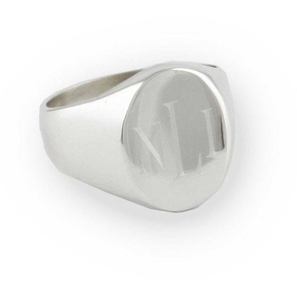 Make a statement with this heirloom quality monogrammed oval face .925 sterling silver signet ring. This classic, unique ring measures a generous 15 mm. x 18 mm. (1/2" x 3/4") and has a solid back. Available in sizes 6-9. Great for men or women who like a larger signet ring.
