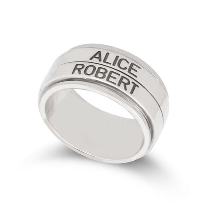Our 9mm sterling silver spinner band name ring is perfect for any man or a lady who prefers a larger ring. The personalized ring features the two names of your choice in block letters.