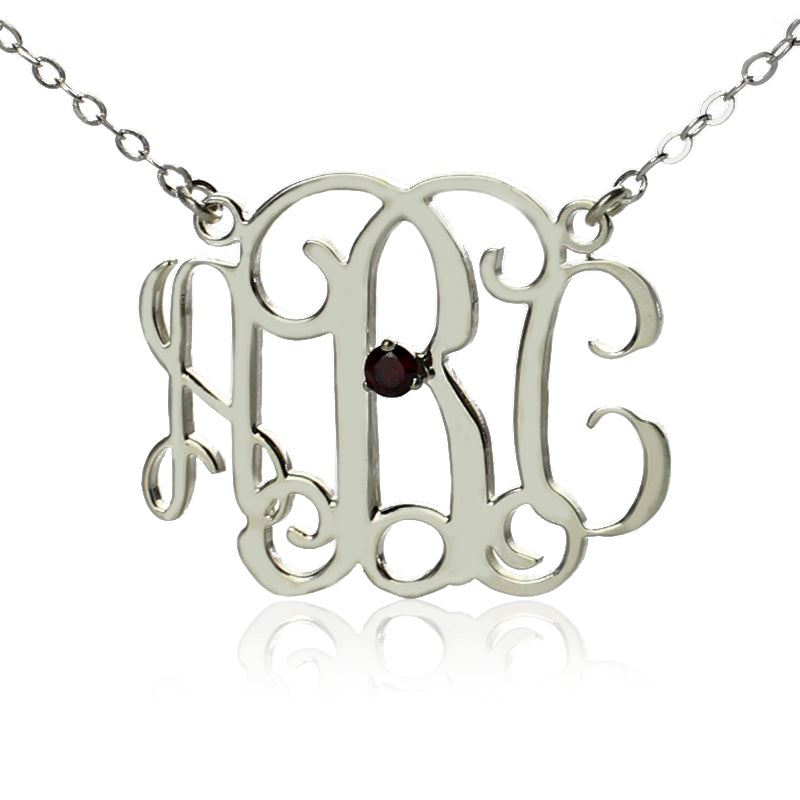 This vine script sterling silver monogram necklace features a pretty vine script that will showcase your initials. The Swarovski crystal accent makes this monogram necklace extra special. The perfect mommy necklace! Monogram measures 30mmx 28mm (1.18" x 1.1") and is 1.2mm thick. Hangs from a cable chain in the length of your choice.