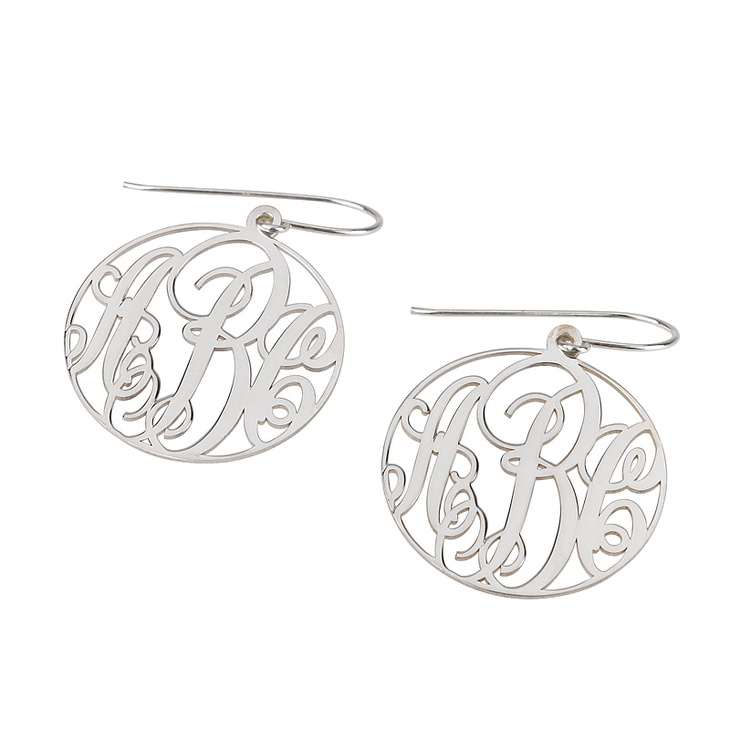 These vine script rimmed monogram earrings are stunning.  Measurements:  thickness: 0.03" and height: 1.2". The fishhook style monogram initial earrings are available in sterling silver and 24K gold plated (24K gold over .925 sterling silver).   Perfect gift idea for any occasion.